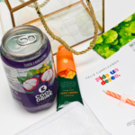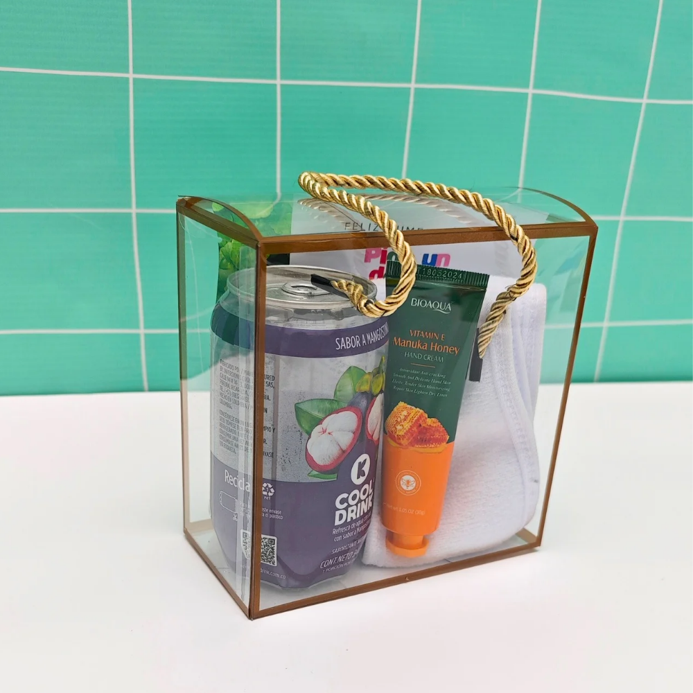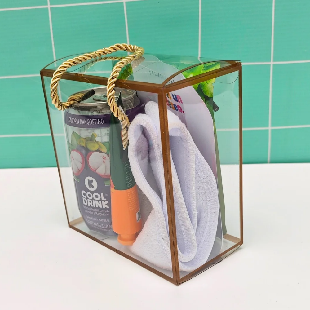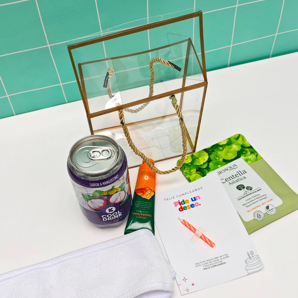 ✨Caja Acetato✨Refresco de Agua con gas sabor a mangostino o sabor a elección ✨Crema para manos ✨ Mascarillas✨Toalla facial o balaca✨Tarjeta