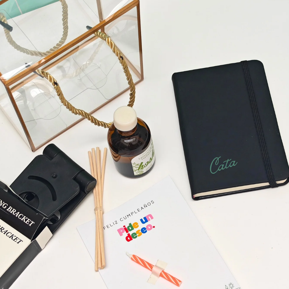 ✨Caja Acetato✨Agenda color negro- blanco- rosa-blanco personalizada ✨ Difusor de olor ✨ Portacelular ✨Tarjeta