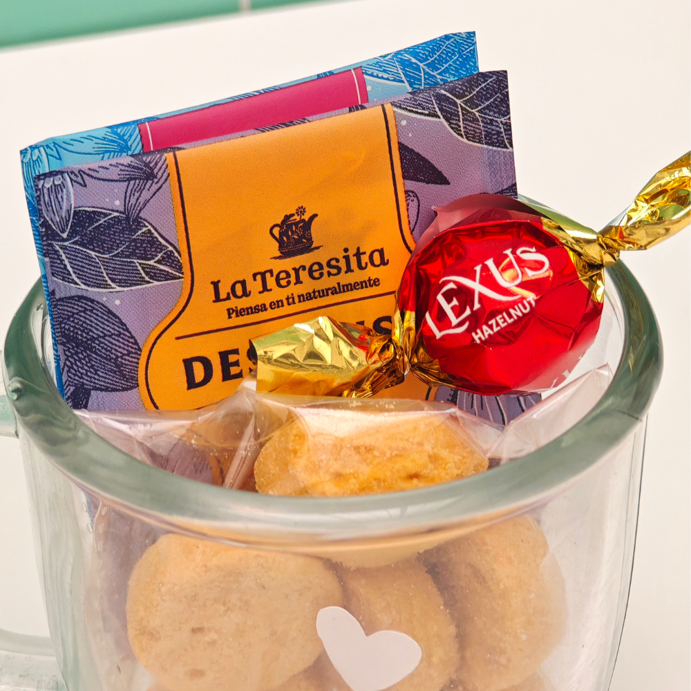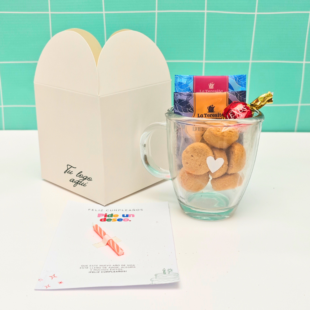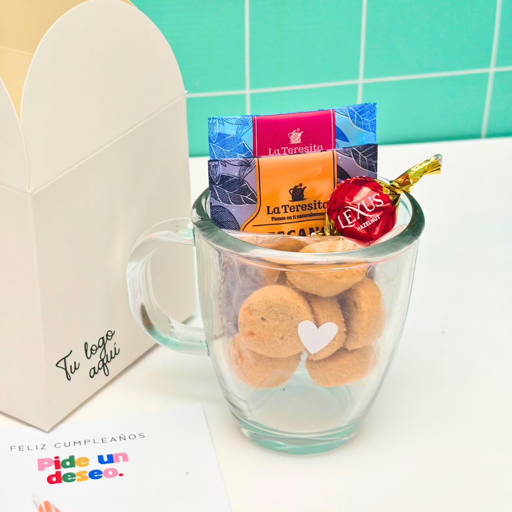 ✨Caja blanca con moño y logo en sticker✨Pocillo en cerámica blanco personalizado ✨2 Aromaticas ✨1 Bombón de chocolate ✨Galletas de Vainilla