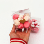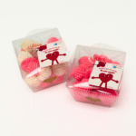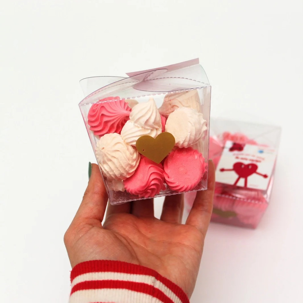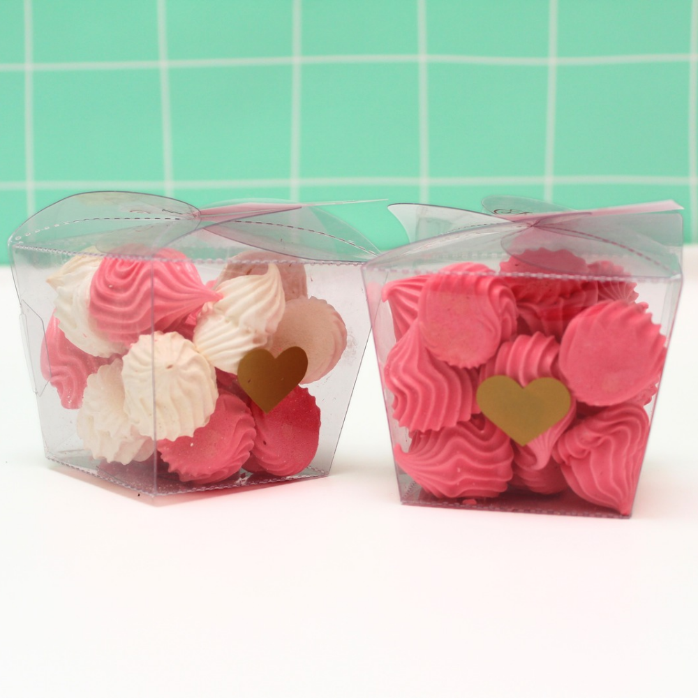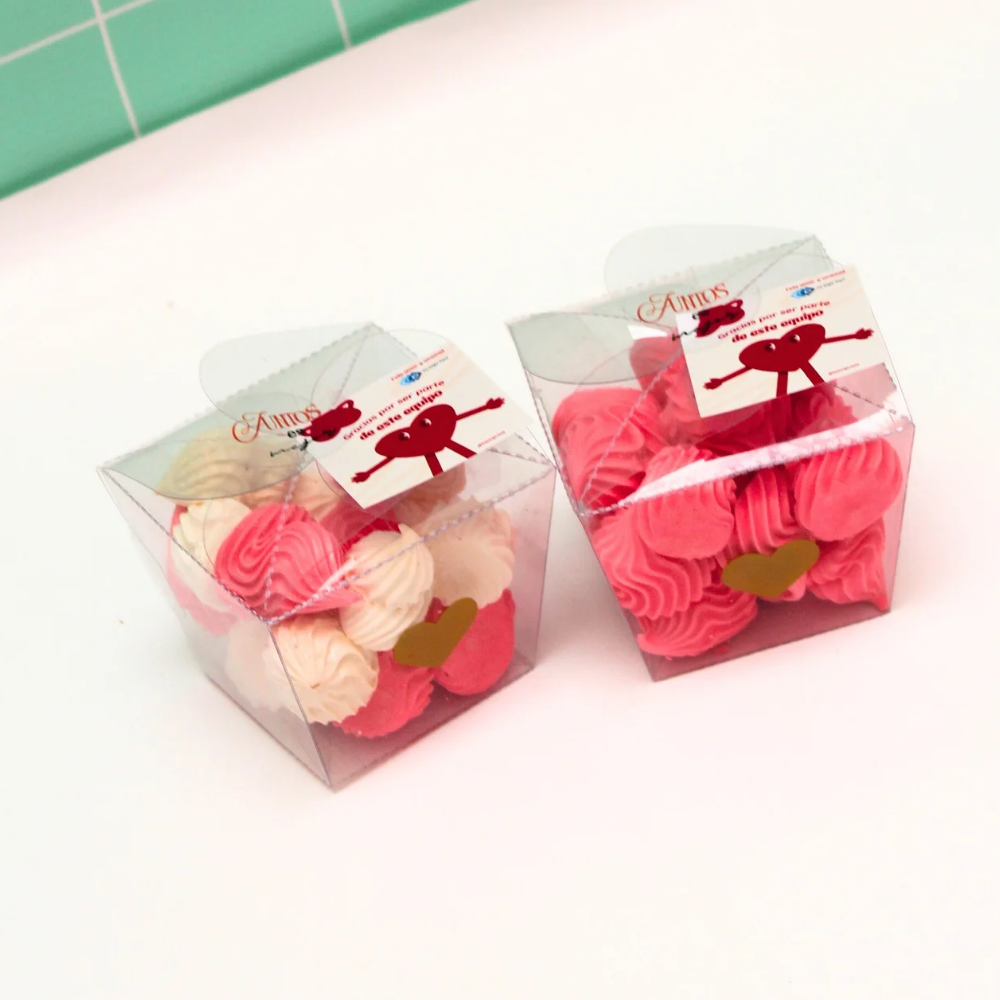 ✨Caja en acetato ✨Suspiros blancos o rosados Aprox de 18 a 20 unidades por caja ✨Tarjeta con logo
