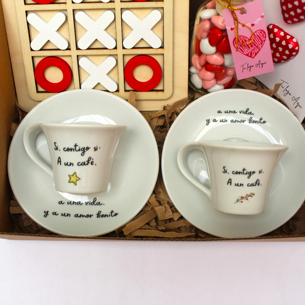 ✨Set de pocillo y plato marcado con frase a elegir ✨ Juego en madera Triqui✨Jar de chocolates de corazones ✨Caja personalizada ✨Tarjeta con chocolates